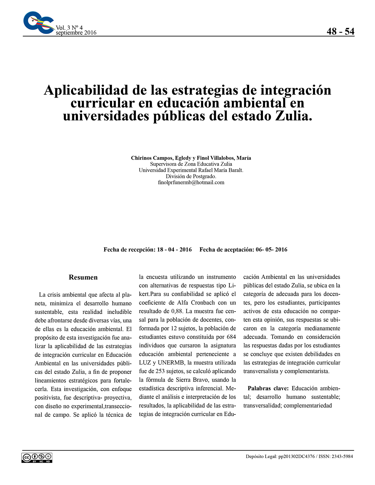de integración curricular en Educación Ambiental en las universidades públicas del estado Zulia, a fi n de proponer lineamientos estratégicos para fortalecerla. Esta investigación, con enfoque positivista, fue descriptiva- proyectiva, con diseño no experimental,transeccional de campo. Se aplicó la técnica de la encuesta utilizando un instrumento con alternativas de respuestas tipo Likert.Para su confi abilidad se aplicó el coeficiente de Alfa Cronbach con un resultado de 0,88. La muestra fue censal para la población de docentes, conformada por 12 sujetos, la población de estudiantes estuvo constituida por 684 individuos que cursaron la asignatura educación ambiental perteneciente a LUZ y UNERMB, la muestra utilizada fue de 253 sujetos, se calculó aplicando la fórmula de Sierra Bravo, usando la estadística descriptiva inferencial. Mediante el análisis e interpretación de los resultados, la aplicabilidad de las estrategias de integración curricular en Educación Ambiental en las universidades públicas del estado Zulia, se ubica en la categoría de adecuada para los docentes, pero los estudiantes, participantes activos de esta educación no comparten esta opinión, sus respuestas se ubicaron en la categoría medianamente adecuada. Tomando en consideración las respuestas dadas por los estudiantes se concluye que existen debilidades en las estrategias de integración curricular transversalista y complementarista.
