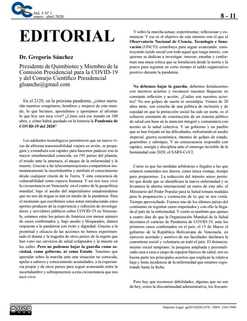 años, y cómo habrá quedado en la historia la Pandemia de COVID-19 del 2020? Los adelantos tecnológicos permitieron que un nuevo virus de altísima transmisibilidad viajara en avión, se propagara y extendiera con rapidez para hacernos padecer con la mayor simultaneidad conocida, en 195 países del planeta, el miedo ante la amenaza, el ataque de la enfermedad y la muerte. Gracias a las telecomunicaciones compartimos instantáneamente la incertidumbre y también el conocimiento desde cualquier rincón de la Tierra. Y esta conciencia de vulnerabilidad como especie humana. Y así nos toca vivir la circunstancia en Venezuela: en el centro de la geopolítica mundial, bajo el asedio del imperialismo estadounidense que no nos da tregua ni aún en medio de la pandemia. Para el momento que escribimos estas notas introduciendo estos aportes producto de la experiencia y reflexión de investigadores y servidores públicos sobre COVID-19 en Venezuela, estamos entre los países de América con menor número de casos confirmados y, bajo asedio y bloqueados, damos respuesta a la pandemia con éxito y dignidad. Gracias a la prontitud y eficacia de las acciones no hemos experimentado el drama y la tragedia de otros países de la región que han visto sus servicios de salud colapsados y la muerte en