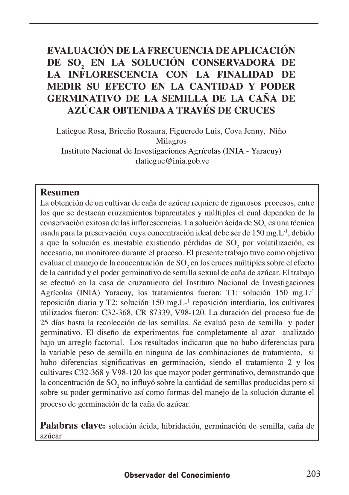 La obtención de un cultivar de caña de azúcar requiere de rigurosos procesos, entre los que se destacan cruzamientos biparentales y múltiples el cual ependen de la conservación exitosa de las inflorescencias. La solución ácida de SO2 es una técnica usada para la preservación cuya concentración ideal debe ser de 150 mg.L-1, debido a que la solución es inestable existiendo pérdidas de SO2 por volatilización, es necesario, un monitoreo durante el proceso. El presente trabajo tuvo como objetivo evaluar el manejo de la concentración de SO2 en los cruces múltiples sobre el efecto de la cantidad y el poder germinativo de semilla sexual de caña de azúcar. El trabajo se efectuó en la casa de cruzamiento del Instituto Nacional de Investigaciones Agrícolas (INIA) Yaracuy, los tratamientos fueron: T1: solución 150 mg.L-1 reposición diaria y T2: solución 150 mg.L-1 reposición interdiaria, los cultivares utilizados fueron: C32-368, CR 87339, V98-120. La duración del proceso fue de 25 días hasta la recolección de las semillas. Se evaluó peso de semilla y poder germinativo. El diseño de experimentos fue completamente al azar analizado bajo un arreglo factorial. Los resultados indicaron que no hubo diferencias para la variable peso de semilla en ninguna de las combinaciones de tratamiento, si hubo diferencias significativas en germinación, siendo el tratamiento 2 y los cultivares C32-368 y V98-120 los que mayor poder germinativo, demostrando que la concentración de SO2 no influyó sobre la cantidad de semillas producidas pero si sobre su poder germinativo así como formas del manejo de la solución durante el proceso de germinación de la caña de azúcar.
